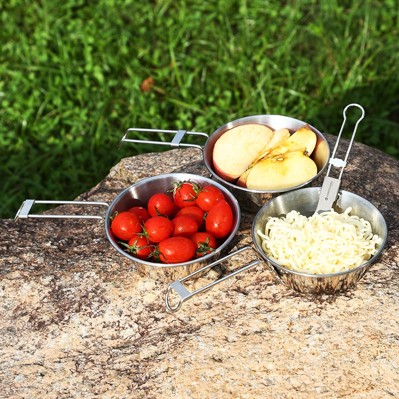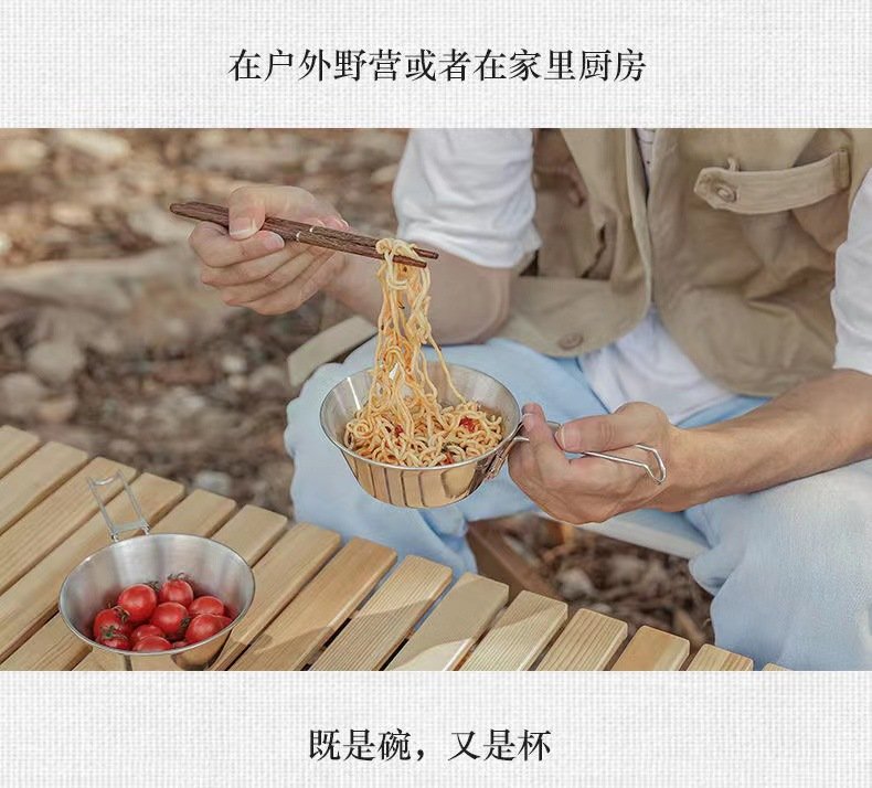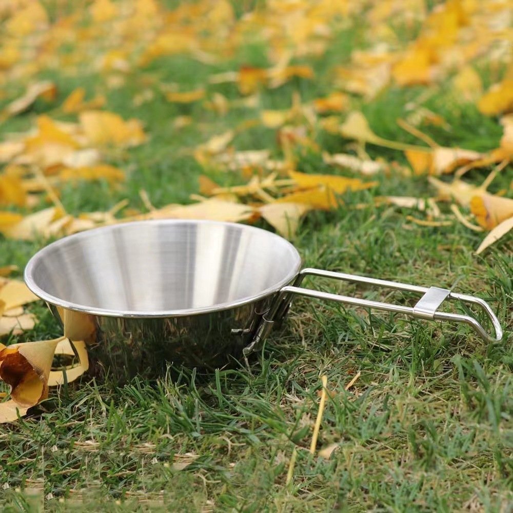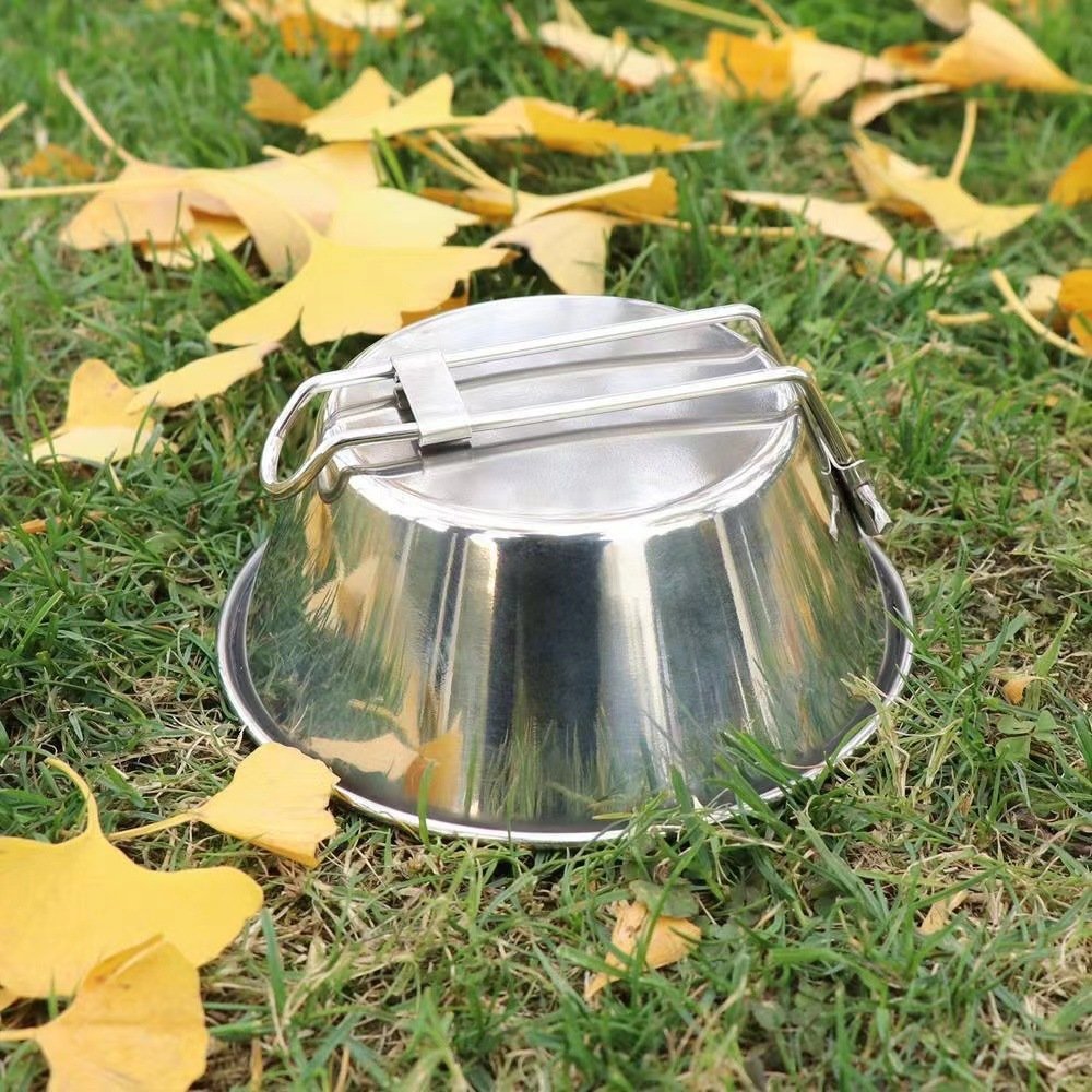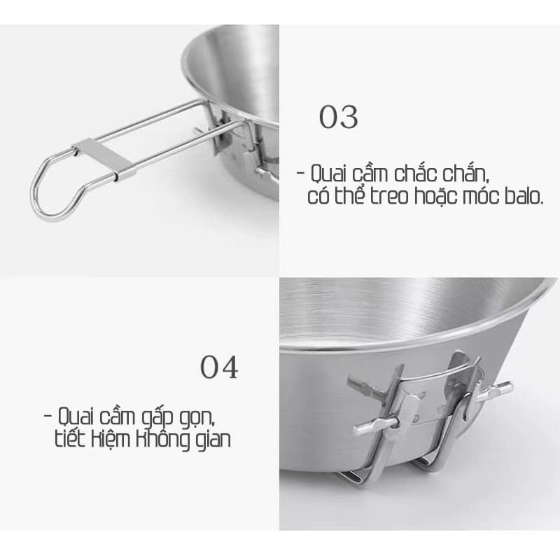 Bát ăn bằng thép không gỉ có tay cầm gấp gọn sử dụng dã ngoại cắm trại ngoài trời. Bát ăn dã ngoại được sử dụng đa năng: đựng và chế biến thức ăn và cả đồ uống như cà phê, đun nước sôi hay làm cối để đâm gia vị.