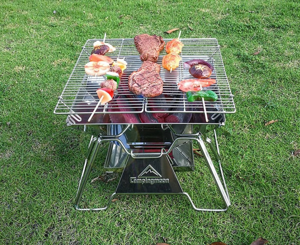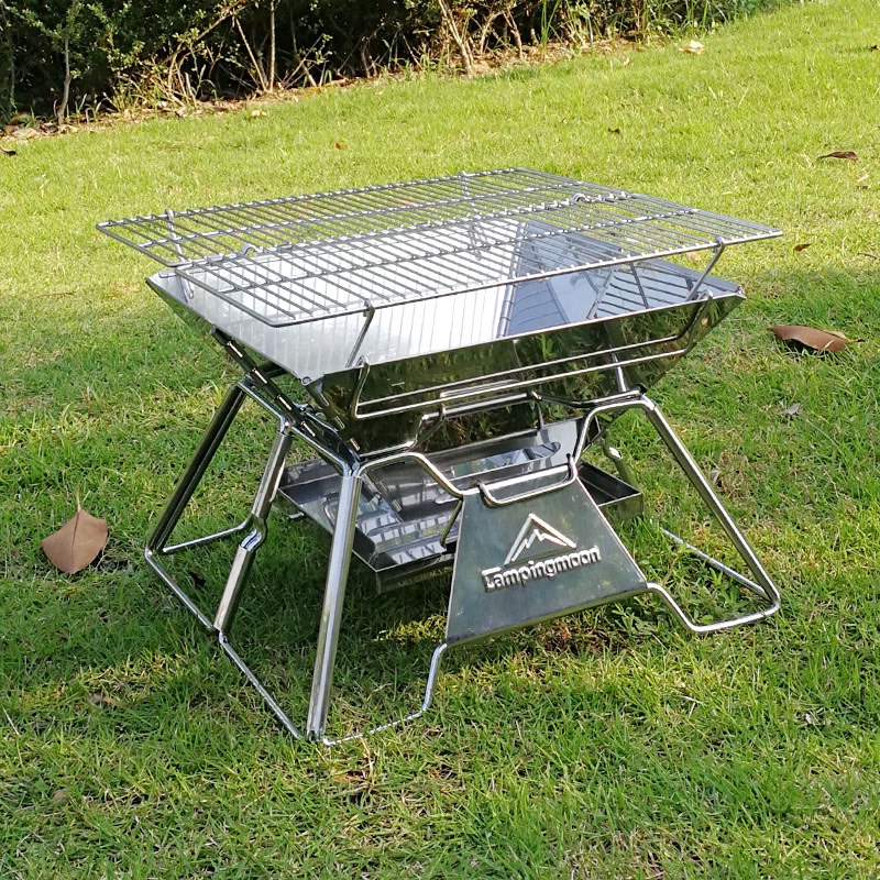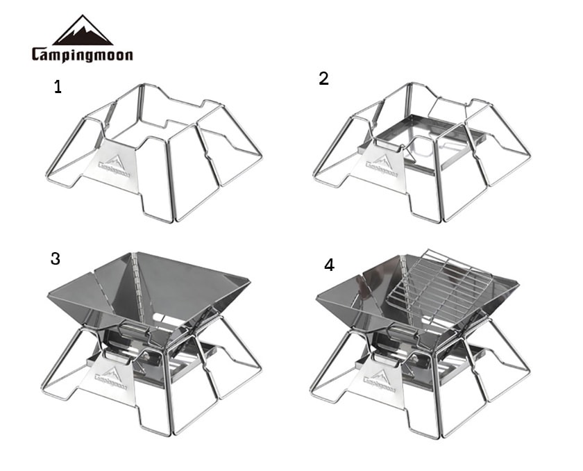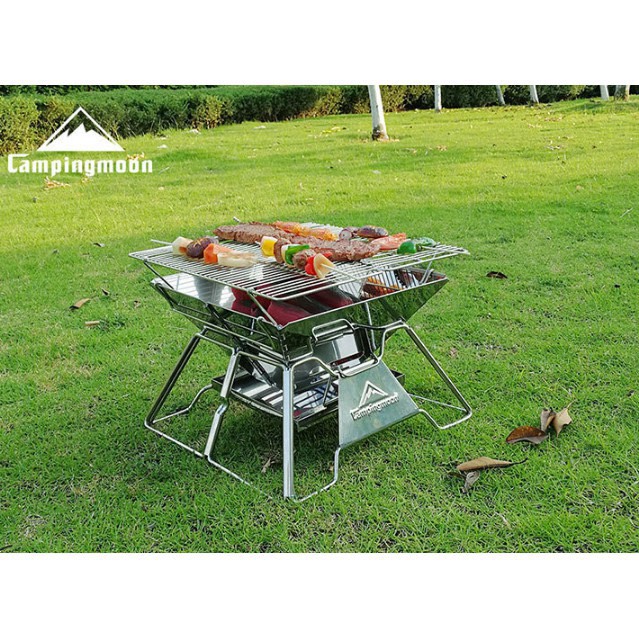 Bếp nướng xếp gọn cắm trại dã ngoại CampingMoon MT-2 được làm từ thép không gỉ chịu nhiệt cao, cứng cáp, an toàn. Đây là loại bếp không thể thiếu trong các buổi BBQ khi đi cắm trại, dã ngoại. Hoặc các party tại gia đình. Bếp có thiết kế thông minh, tháo lắp dễ dàng, có ngăn đựng than. Nên bạn có thể mang bếp lên sân thượng để thưởng thức những món ăn nướng từ than hoa đầy hấp dẫn mà không sợ bẩn nhà. Thép của bếp chịu nhiệt tốt, an toàn cho sức khỏe người dùng khỏi đồ ăn bị cháy khét khi nướng. Độ bền cao, thời gian sử dụng lâu dài. Thiết kế bếp tối ưu việc tụ nhiệt, giúp tiết kiệm than, việc nướng trở nên nhanh chóng, dễ dàng. Ngoài dùng để nướng đồ ăn, bạn có thể sử dụng để nấu nước hoặc làm bếp sưởi ấm cá nhân. Vỉ nướng của bếp có thể điều chỉnh độ cao để tránh cháy khét đồ ăn khi lửa bếp còn khỏe. Khi than đã gần hết hoặc yếu đi, bạn có thể để sát xuống để đồ ăn mau chín. Bộ bếp được tháo lắp dễ dàng, nhanh chóng, chắc chắn. Có túi vải quai xách đựng bếp, tiện dụng mang theo trong các chuyến đi cắm trại, dã ngoại. Bếp dễ dàng vệ sinh sau khi sử dụng với các đồ rửa chén trong bếp thông thường