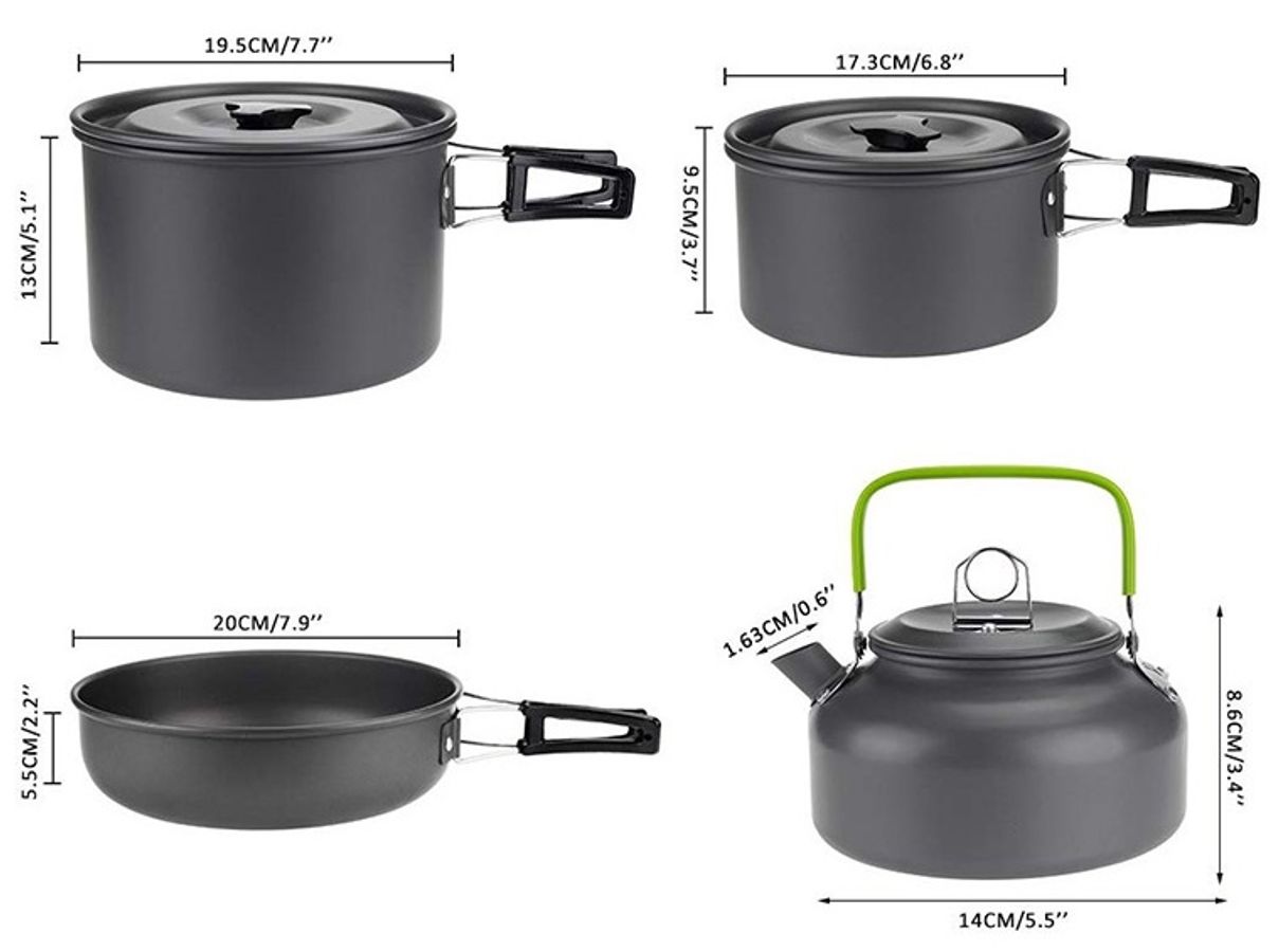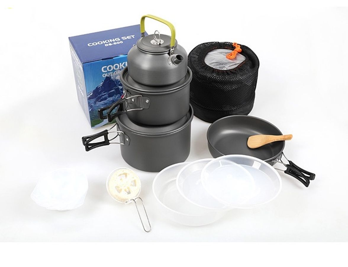 Bộ nồi nấu ăn gấp gọn sử dụng thoải mái cho 4-5 người có khả năng chống dính alumina với thiết kế gọn nhẹ, thông minh phù hợp cho các chuyến đi dã ngoại, cắm trại ngoài trời. Bộ nấu ăn với khả năng xếp gọn rất phù hợp cho việc chuẩn bị bữa ăn và nước uống cho 4-5 người. Gồm: 1 chảo + 2 nồi + 1 ấm + 5 bát nhựa + 2 đĩa nhựa + 1 thìa cơm gỗ + 1 miếng chà rửa bát + 1 muỗng nhựa