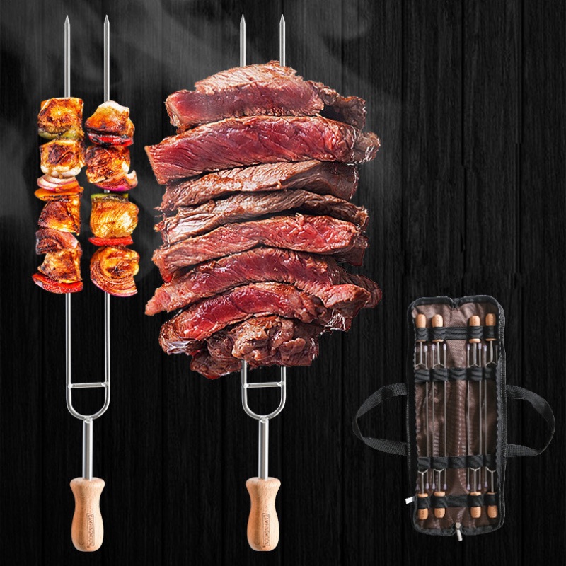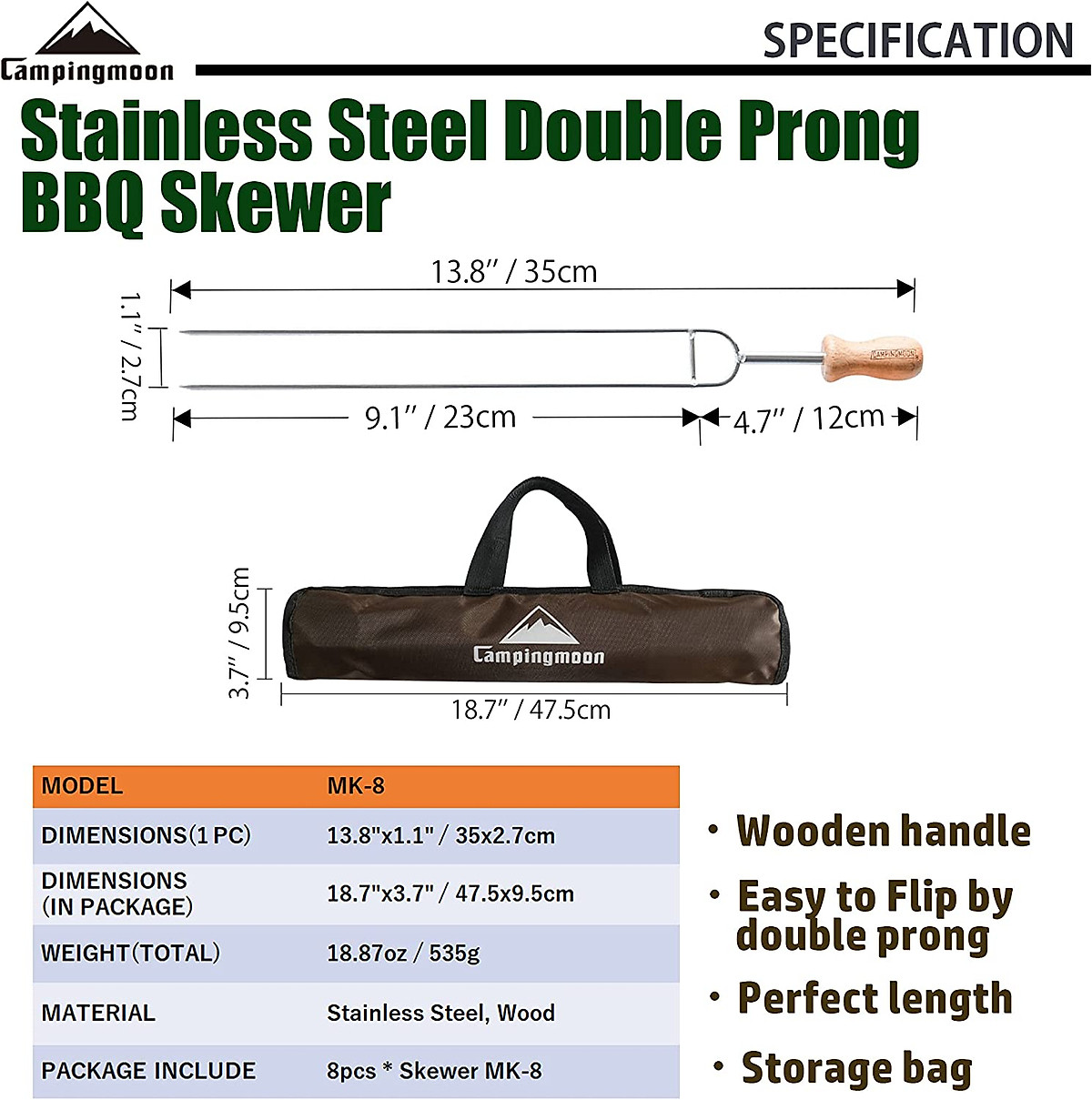 Que xiên nướng Campingmoon MK-8 trọn bộ gồm 8 que xiên đôi được đựng trong một túi đựng chắc chắn. Thiết kế xiên đôi giúp đồ ăn không bị lật trong quá trình nướng trên bếp than hoa. Que xiên nướng MK8 được thiết kế với tay cầm bằng gỗ làm tăng khả năng cầm nắm của người sử dụng và tránh nóng khi cầm vào que.