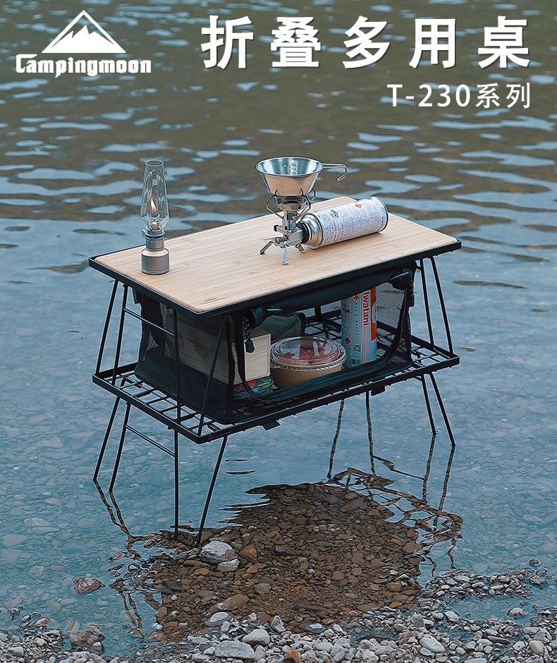 Kệ để đồ dã ngoại Campingmoon T-230 là một giá để đồ hoàn hảo cho mỗi chuyến dã ngoại của gia đình, có thể đặt các vật nóng như nồi, chảo, giữ cho đồ đạc được khô ráo, ngăn nắp, tiết kiệm không gian, được thiết kế có thể gập gọn, thích hợp cho các chuyến picnic, cắm trại, dã ngoại.