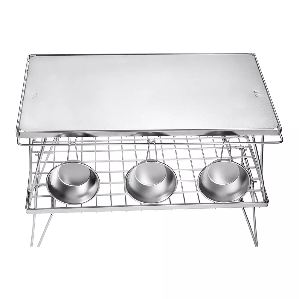 Mặt bàn inox đa năng Campingmoon T-2305 được làm bằng thép không gỉ 304, có khả năng chịu nhiệt và có thể đặt trực tiếp nồi lên đun nóng.Bề mặt trên cùng được hoàn thiện bằng quy trình dập nổi đặc biệt và được vát mép cẩn thận.Bạn có thể treo các vật dụng nhỏ lên khung.